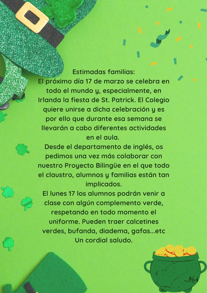 El próximo día 17 de marzo se celebra en todo el mundo y, especialmente, en Irlanda la fiesta de St. Patrick. El Colegio quiere unirse a dicha celebración y es por ello que durante esa semana se llevarán a cabo diferentes actividades en el aula.
